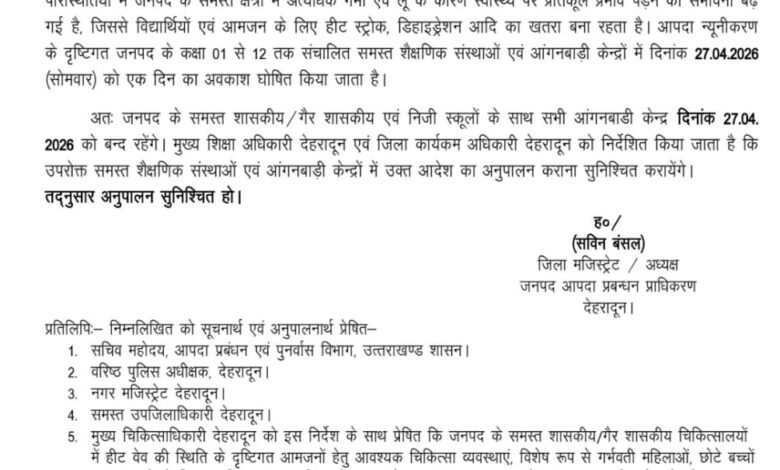 (रिपोर्ट@संवाददाता)।                                   देहरादून/उत्तराखंड भास्कर-  जनपद में लगातार बढ़ते तापमान और हीट वेव (लू) के प्रकोप को देखते हुए जिला प्रशासन ने बड़ा फैसला लिया है। जिलाधिकारी/जनपद आपदा प्रबंधन प्राधिकरण देहरादून द्वारा जारी आदेश के अनुसार 27 अप्रैल 2026 (सोमवार) को जिले के सभी सरकारी, गैर सरकारी व निजी स्कूलों के साथ-साथ आंगनबाड़ी केंद्रों में एक दिन का अवकाश घोषित किया गया है।